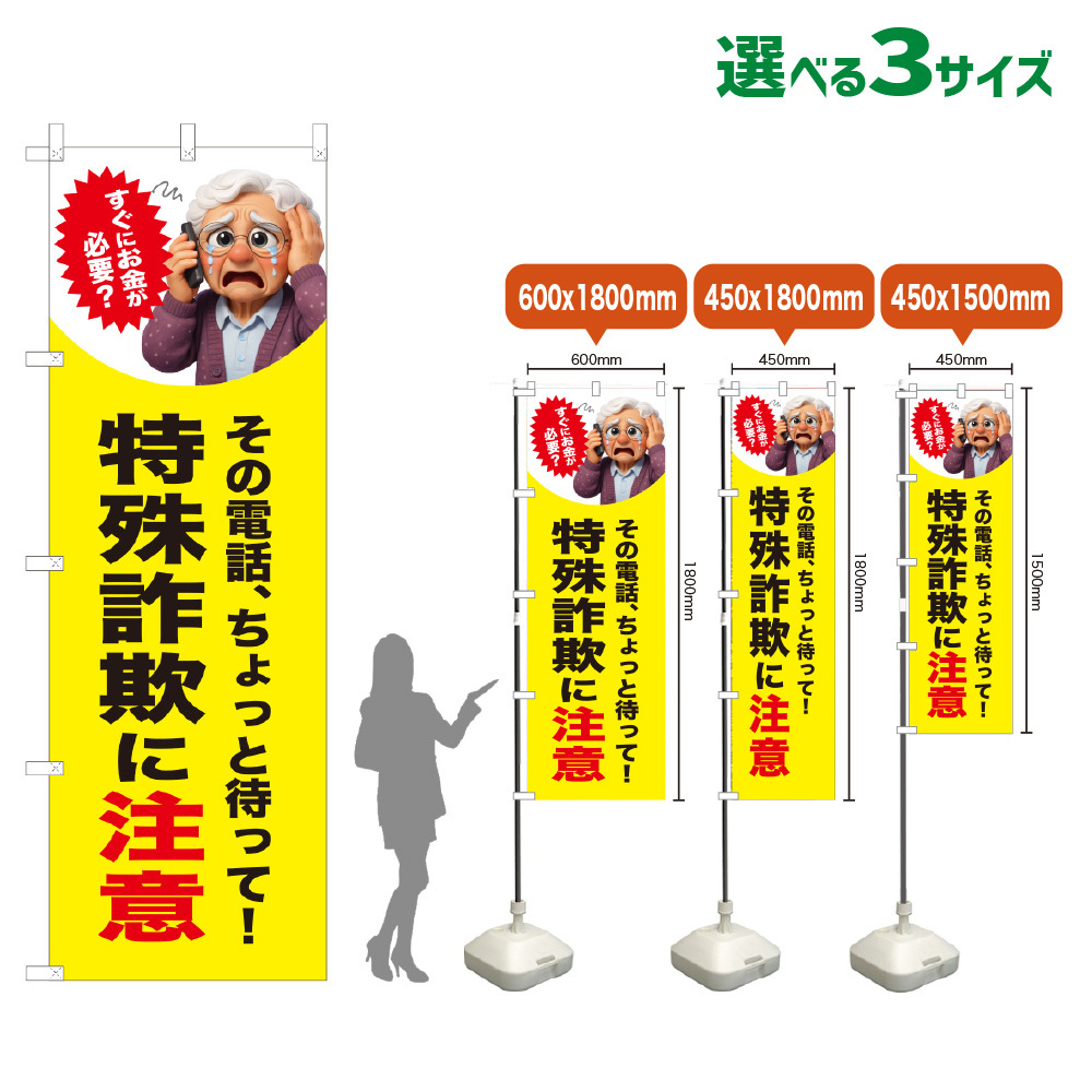 のぼり旗 特殊詐欺に注意 (お金が必要?女性)(黄) [VKL-0280・VKM-0280・VKS-0280]