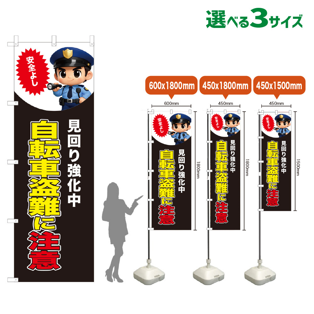 のぼり旗 自転車盗難に注意 (見回り強化中)(黒) [VKL-0297・VKM-0297・VKS-0297]