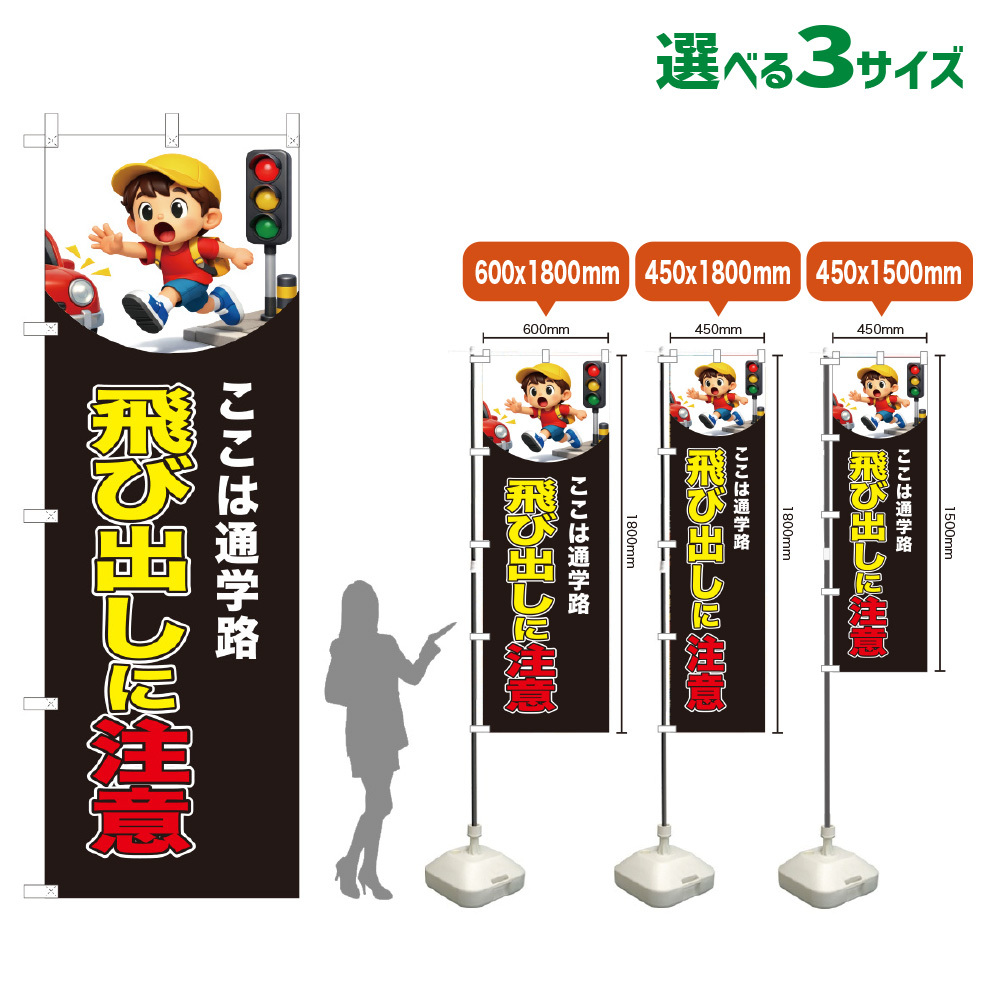 のぼり旗 飛び出しに注意 (黒) [VKL-0307・VKM-0307・VKS-0307]