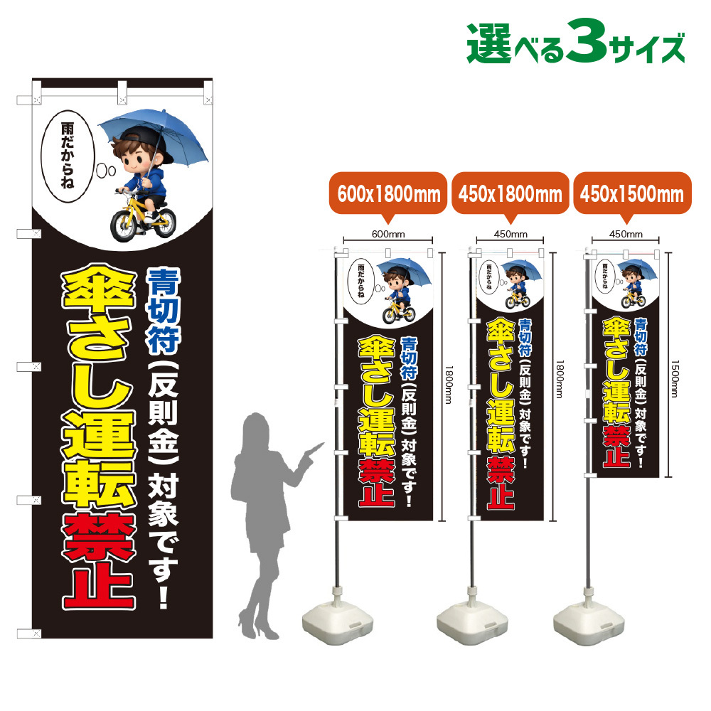 のぼり旗 傘さし運転禁止 (青切符)(黒) [VKL-0315・VKM-0315・VKS-0315]
