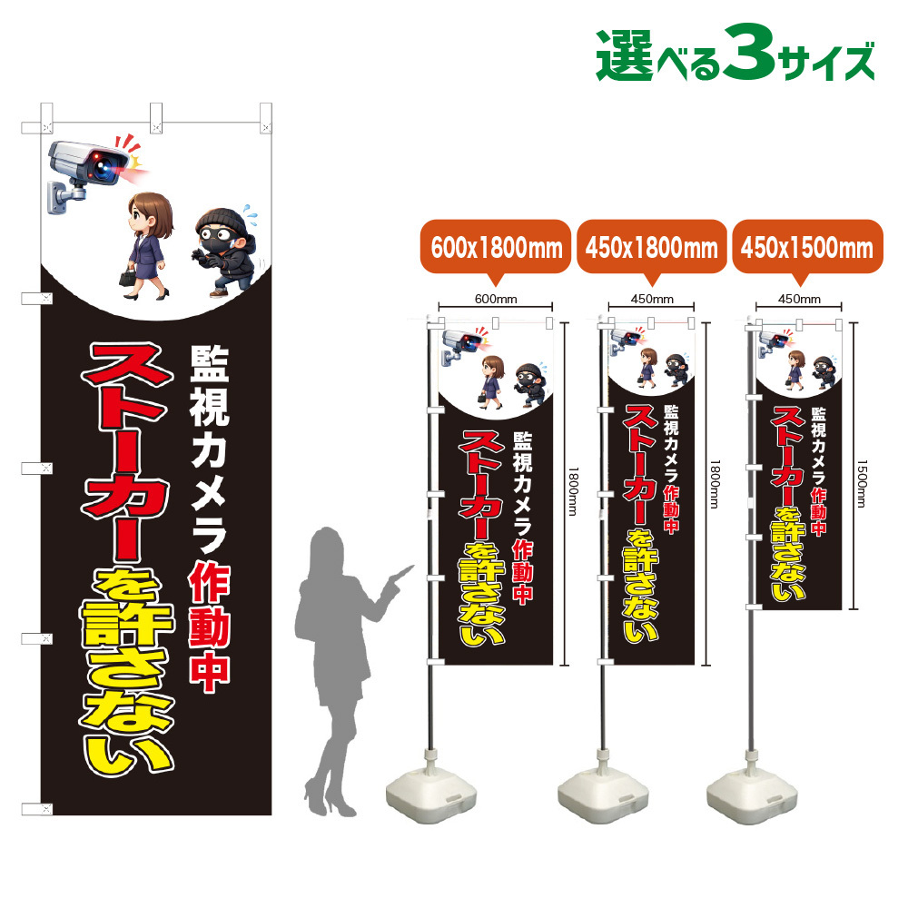 のぼり旗 ストーカーを許さない (監視カメラ作動中)(黒) [VKL-0341・VKM-0341・VKS-0341]